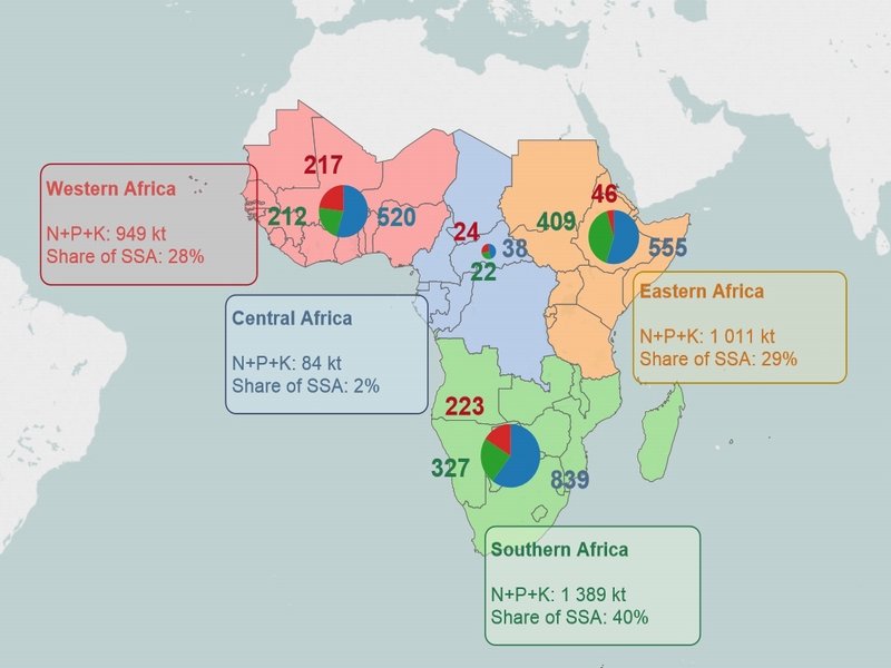 La Asociación Internacional de Fabricantes de Fertilizantes (IFA) ha publicado recientemente una estimación detallada del consumo de fertilizantes en África Subsahariana durante el pasado año 2014, calculando una cantidad de casi 3,5 millones de toneladas de nutrientes (2 millones de toneladas de N, 1 millón de toneladas de P2O5 y 500.000 toneladas de K2O). IFA divide dicha región en cuatro partes: